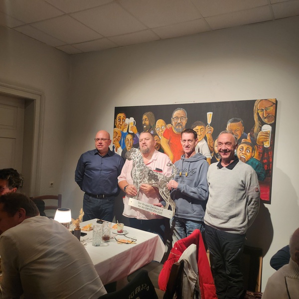 Groß goldgestromt mit Weiß 13 Monate schlanker, sehr gut gewölbter Oberkopf die Ohren sollten besser anliegen, breiter, voller Fankg , dunkelbraune Augen, die dunkle Maske könnte besser durchgefärbt sein. Fast korrekte Nasenlänge große Nasenlöcher, mittelbreiter Zahnstand. Substanzvolles, fast quadratisches Gebäude, sehr gute Ober-und Unterlinie, sehr gute Brusttiefe vorne gut und hinten sehr gut gewinkelt schubstarker Bewegungsablauf mit leichten Ellenbogenspiel.